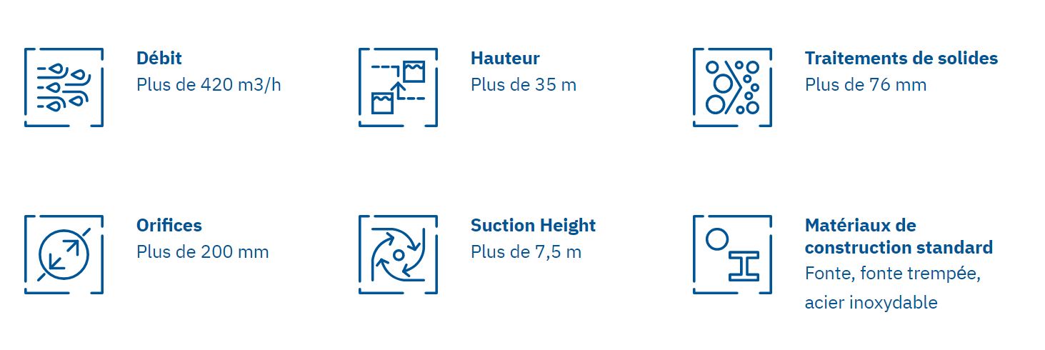 - Turbine semi-ouverte à deux pales permettant le passage des corps solides jusqu’à un diamètre de 75 mm (3”).